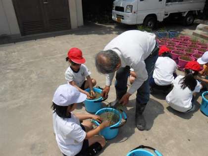 育った稲を一度抜きます。そして,よく育った株を3株選んで,もう一度バケツの中に植え直します。