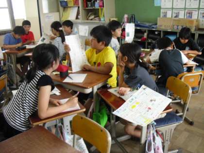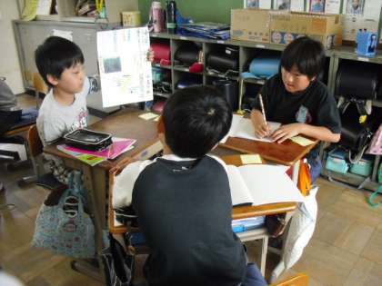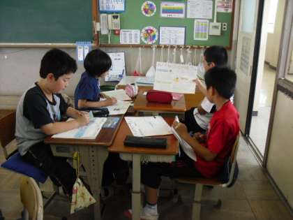 社会の学習で沖縄の気候や産業,文化などを調べた新聞が完成し,発表会を行いました。自分の発表だけでなく,友だちの発表を聞いて, 新たに知った事はノートにメモをしました。また,新聞のできばえをお互いに評価しあいました。