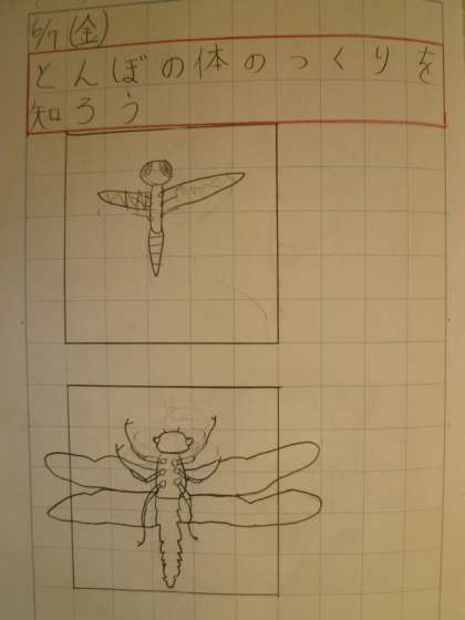 今日は,トンボの体のつくりを勉強しました。