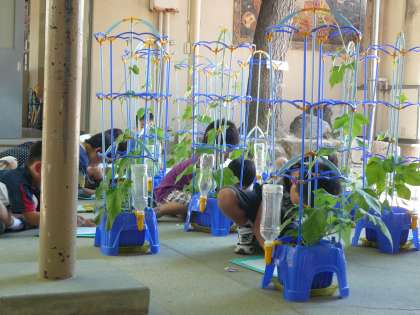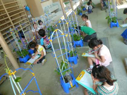 支柱に巻きついたつるはぐんぐん伸びていて,子どもたちの身長を追い抜いていました。