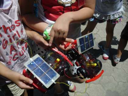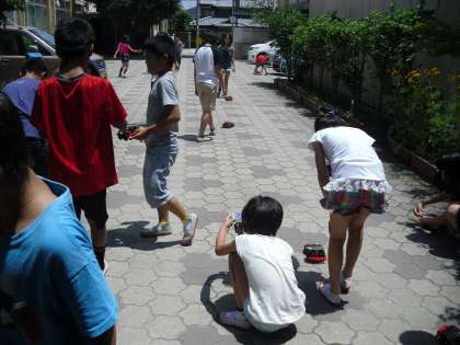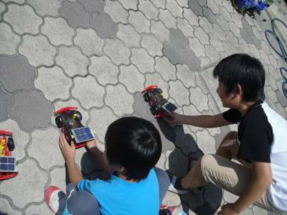 今日のお天気を待っていました!!理科「電池のはたらき」の学習で,光電池の学習をしました。光電池の向きを変えたり,日なたの方へ行って場所を変えたりして走らせていました。どうしたら車が走るのか。またより速く走るにはどうしたらいいのかなど,色々試しながら走らせていました。