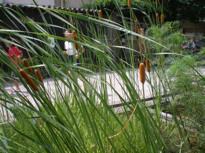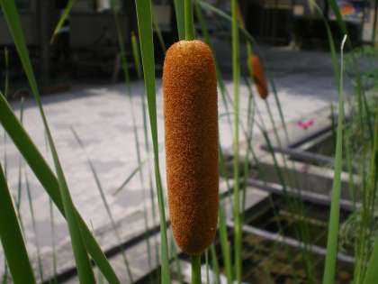 今,中庭の池のそばでは,ガマの穂が夏の日差しをいっぱい受けて,大きく成長しています。