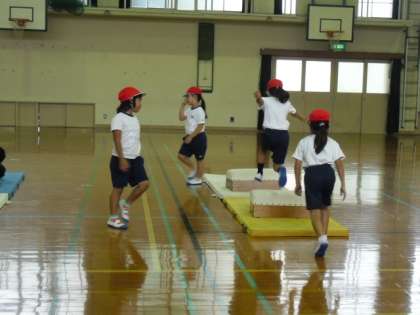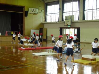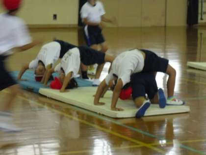 体育は,マット運動をしています。「さか」「わにわに」「ブリッジ」「バランス」「さかだち」「どうぶつあるき」「ころがり」「だんだんばたけ」の8種類の場を設定しています。ブリッジをしたり,側転をしたり,ジャンプをしたり前転・後転もしています。いろいろな動きができてとても楽しそうです。