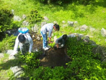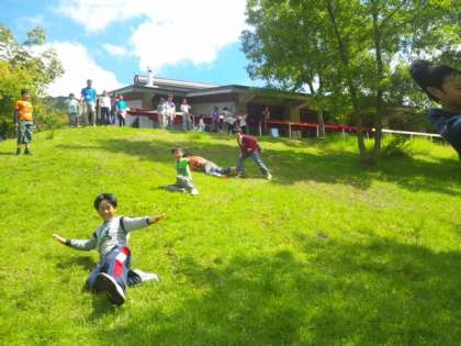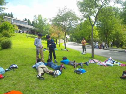 近くの川で遊ぶ子、芝生の斜面をかけ降りたり、滑り降りたりする子、芝生に寝転がって昼寝する子…