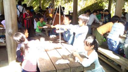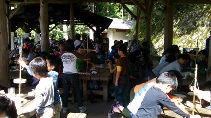 昔の方法で火おこしを体験することで、火の大切さ