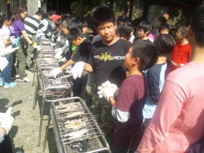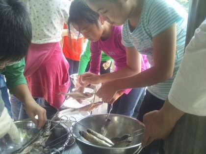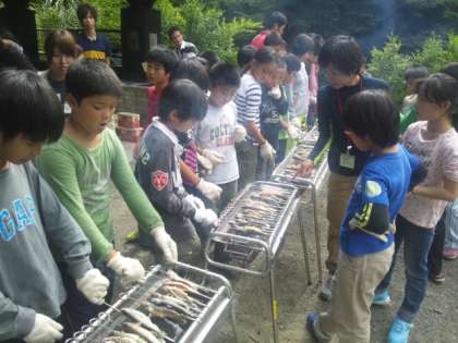 串にさしたら、塩をふって、炭で焼きます。