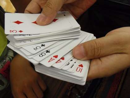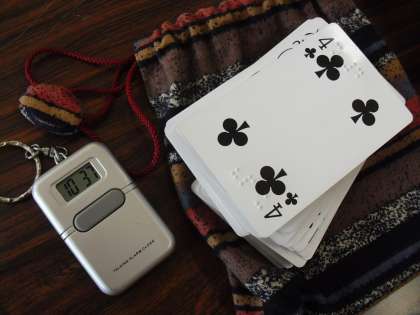 様々なところに点字は使われています。今日は,トランプや名刺をみせていただきました。ボタンを押すと時間を知らせてくれる時計もあります。