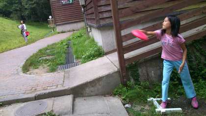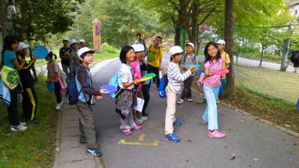 フライングディスクゴルフは、フライングディスクというフリスビーのようなものを投げ、そのホールをゴルフのように競うゲームです。