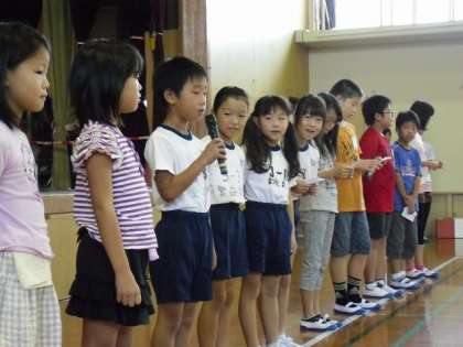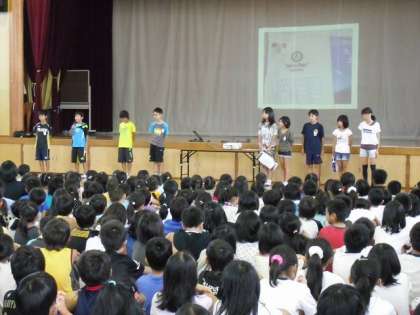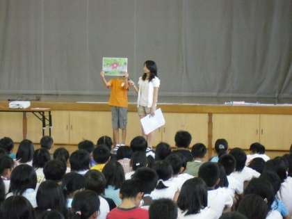 9月の児童朝会は,とても盛りだくさんでした。まずは,いつものように児童会の本部役員の司会により始まり,各委員会からのお知らせです。栽培委員会は,今学校に咲いている花の紹介。環境委員会からは,牛乳パックの回収量の報告と優秀クラスの発表がありました。その次に,7月・8月の冠句の表彰です。自分の句をみんなの前で,読み上げました。