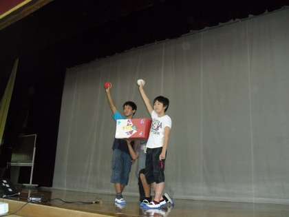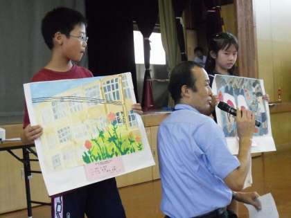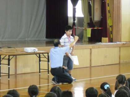 引き続き,京都こども美術展の表彰。このときもどんな気持ちを表したか,どんなふうに色を作ったかなども説明してくれました。更に,嵐山子ども相撲大会の入賞の表彰もありました。メダルも披露しましたが,来年はもっと上のメダルを狙うとの決意も表明しました。そして,最後は今年の運動会の赤組・白組を決定しました。暫定的に分けられたグループが,どっちが赤組になるか,白組になるかを,応援団長がくじをひきました。決定の瞬間は,ドラムが響き,大歓声があがりました。さあ,今から運動会当日に向けて,いよいよ本格的な練習が始まります。