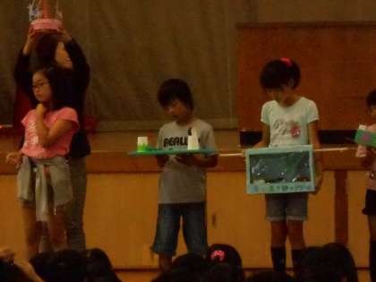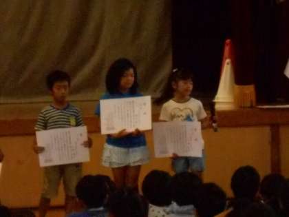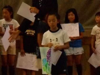 児童朝会では委員会の発表の後,絵画・書写・工作等の表彰がありました。