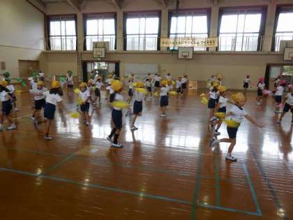 今日は頭にはバンダナをつけて,右手にポンポンを持って踊りました。