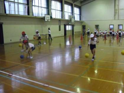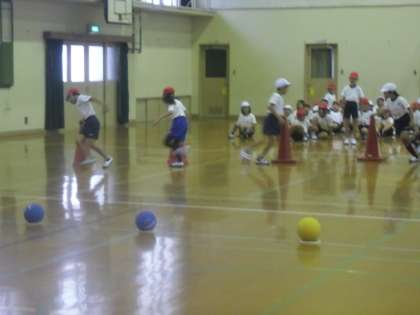 体育の時間には,80メートル走,2013☆竹取物語,ハンター競走中,の練習を学年で取り組んできました。体育館の中では,ハンター競走中のドリブルの練習をしました。