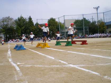 たくさんの人が見ている中,走るだけでも緊張するのに,障害物を通過して走りきるのはさらに緊張することでしょう。みんなけがなく無事走り終えました。