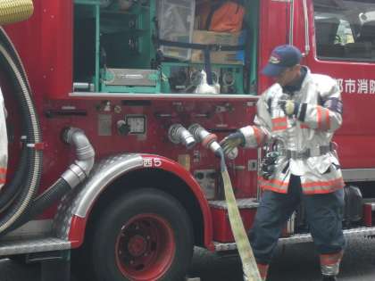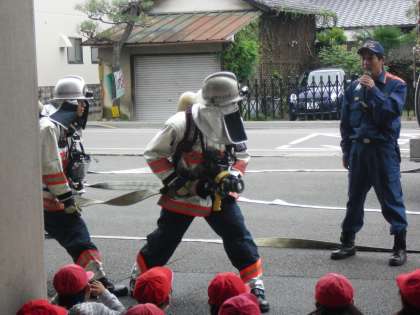 朝からお天気が心配でしたが,西京消防署へ社会見学に行ってきました。火事の通報があったとき,一刻も早く現場に出動ができるよう,防火服と防火靴をセットして一緒にして置いてあることなど,出動時の工夫をいろいろ教えてもらいました。また,ポンプ車について詳しく教えてもらいました。みんな初めて知ることが多かったようで,興味深々な様子でした。
