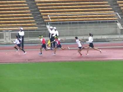 予選・準決と1位で勝ち上がり,決勝ではわずかの差で右京区嵯峨野を退けてゴールしました。桂東リレーチームは,小学生では難しいと言われている,下から振り上げるバトンを受け取る,アンダーハンドパス(北京五輪より日本チームが採用)を使い,走力と技術力を結集して1位を獲得しました。