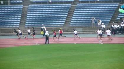 小雨の降る中,準決勝でのバトンパスのもたつきを解消すべく,きちんとトラックの助走を始めるポイントにガムテープで印して決勝に臨みました。