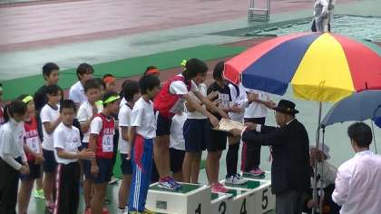 アンカーに渡ったときは横一列でしたが,そこから桂東が一歩抜き出てゴールしました。応援の桂東学区の方々も大喜びで,優勝したのはおそらく初めてではないかとのことでした。