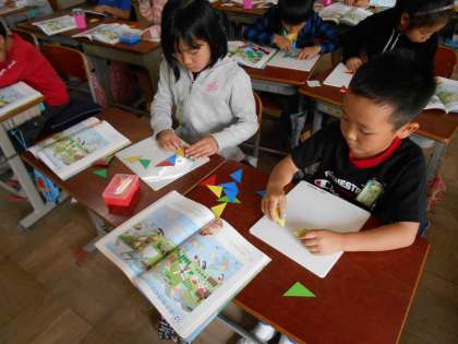 教科書の絵を見て同じ形を作るのは,思っていたよりも難しかったようで,子どもたちは色板を回したりひっくり返したりしながら,一生懸命作っていました。