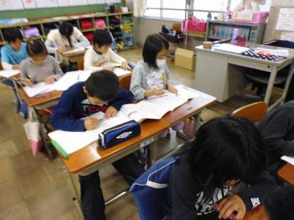 繰り上がりに気をつけ,ノートに丁寧に一問ずつ書きうつし,取り組んでいます。みんな一生懸命です。たくさんの問題に挑戦し,すらすら正しい答えを出せるように頑張っていきます。