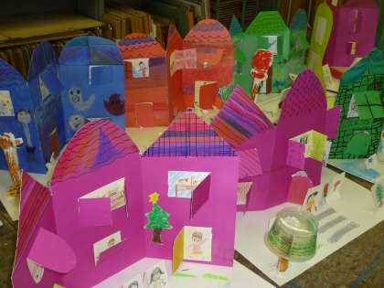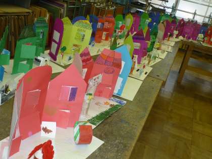 みんなの作品をつなげると,楽しい街並みになりました。