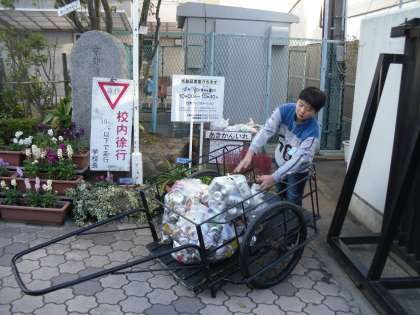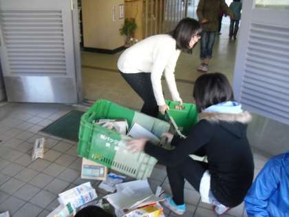 今日(12日)は木曜日でしたので,環境委員会がリサイクルに取り組んでいる牛乳パックやペットボトルのふた,乾電池,インクジェットプリンター用インクボトルなどの整理の日です。