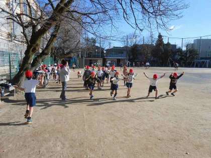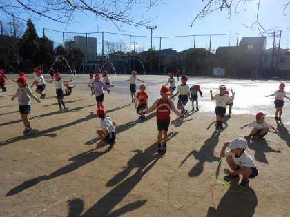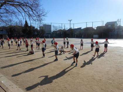 後半はなわとびマラソンです。前回し跳びでできるだけ長く跳び,つかえたらしゃがむ。きまった時間がんばって跳べたら拍手で祝福,という流れで,こちらも様々な跳び方でチャレンジしました。中には二重跳びで1分間跳び続けた児童もいて,みんなが感心していました。