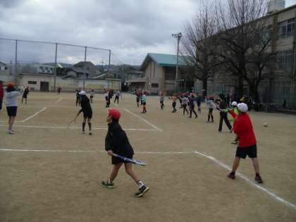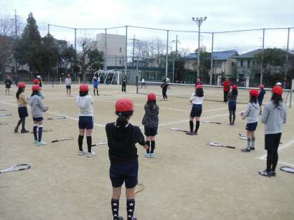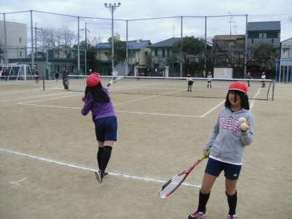 テニス部は,2月に行われる支部の交流会や校内の大会に向けて寒さに負けずに頑張っています。今年は部員が増えたので,気温は低いですが,練習には活気が感じられます。