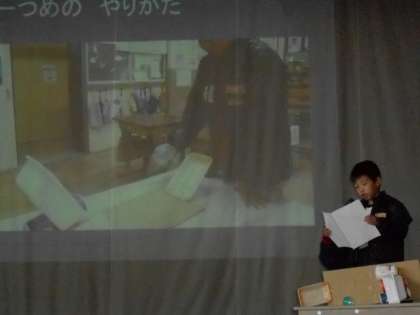 発表では,実際に舞台の上でおもちゃを遊んで見せたり,遊び方を動画で映し出したりして,分かりやすく発表しました。