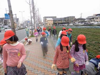 下を一生懸命見ながら,一つ一つ小さなゴミまで拾って歩きました。今日もたくさんのゴミを拾い,道がきれいになりました。