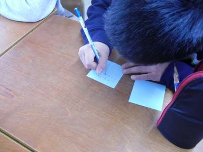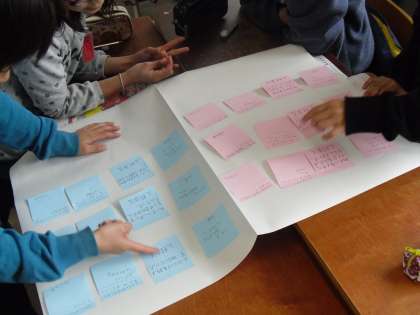 冬休みのエコライフをもとに,できたことを青色の付箋に,できなかったことを赤色の付箋にそれぞれ3枚,合計6枚書き,班ごとに話し合いをしました。