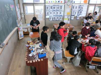 4年2組では牛乳パックを使って飛び出すおもちゃを作りました。