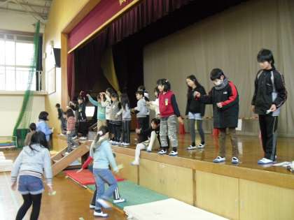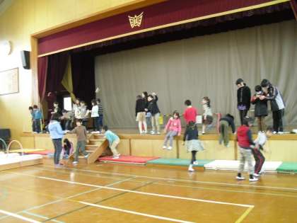 いつもは遊ぶことのできない舞台の上から,楽しそうに飛ばしていました。
