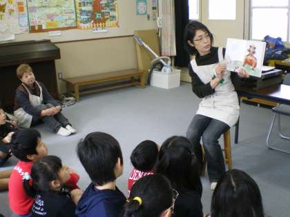 今日は,10日。10のつく日なので,中間休みに地域のボランティア(桂東小学校図書ボランティア〜クローバーの会〜)のお母さま方による絵本の読み聞かせがありました。
