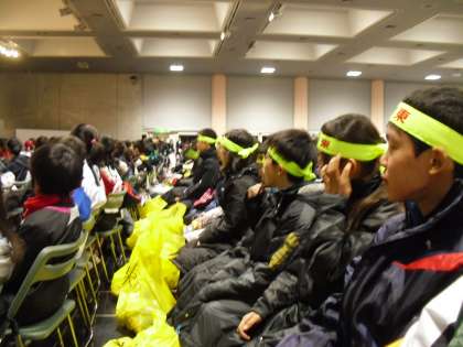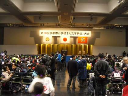 朝,8時過ぎに岡崎公園の「みやこメッセ」で受付した後,8時45分から出発式がありました。京都市小学校スポーツ連盟会長の北村校長先生の挨拶に続き,審判長である阪田校長先生から諸注意があり,いよいよ選手の送り出しが始まりました。