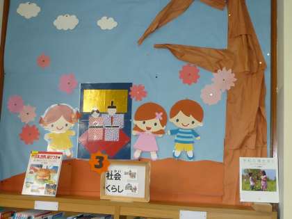 一足先に,図書館に春がきました。図書ボランティアのクローバーさんが,図書館の壁面を,3月のお雛様のして下さいました。