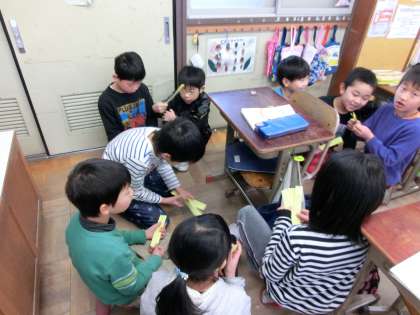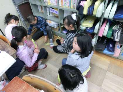 国語科の学習,『楽しかったよ二年生』では,一年間を振り返って,自分の成長を知ったり,その喜びを綴ったりする機会となります。自分で書きたいことを決め,思い出して書くことを,友だちと確かめ合っています。