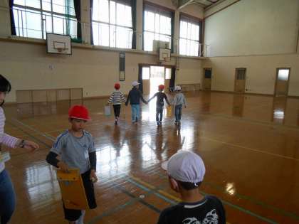 みんなで体育館に集合し,1・2年生のグループで出発します。仲良く手をつないで,まずは1年生の靴の棚に向かいました。