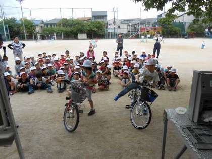 自転車には左側から乗って,左側に降りること(右だと,もしも倒れた時,車道側に倒れて危険だから)ということを初めて知って,「へぇ〜」と感心している子ども達でした。