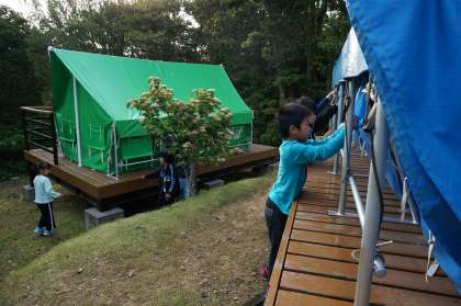 子どもたちは,寝具の片づけをし,テントやバンガローの簡単な整理・清掃を始めました。この後,一緒に宿泊している大塚小学校と合同で「朝の集い」です。