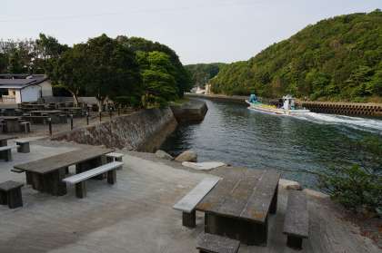 朝の深谷水道は,漁に向かう船が英虞湾から太平洋へひっきりなしに通ります。