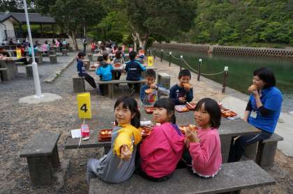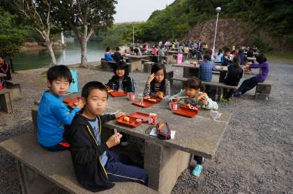 深谷水道に面した場所なので,波の音を聞きながらの食事です。漁から戻ってくる漁船に手を振ると,どの船も乗組員の方が手を振り返してくれました。