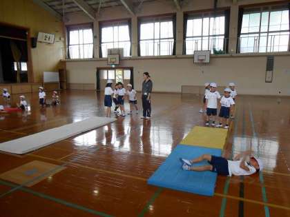 準備運動をした後,マットの上を転がります。