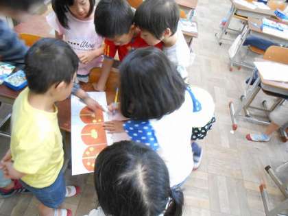 みんな,「ジャガイモの増え方」が何通りか書かれた紙を見て,自分の考えを選び紙に名前を書いていきました。