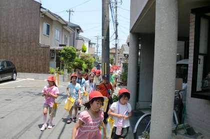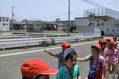 5月29日(木),たいへん暑い一日でしたが3度目の校区探検に行ってきました。今回は,稲荷山町を歩いてチビッ子広場を通り桂川街道まで行きました。途中,牛ケ瀬公園で休憩をとり帰路につきました。もうすでに田植えが終わった田んぼの横を通って,汗をかきかき学校へ帰りました。