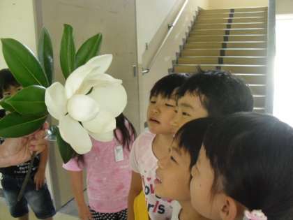 1年生の子どもたちは顔より大きな花に,顔を近づけて