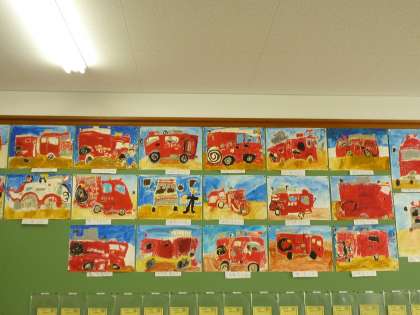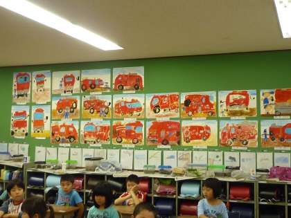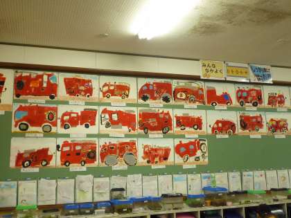 みんなが,しっかり見て書いた消防自動車が完成し,各教室に掲示してあります。