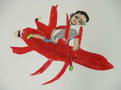 絵の中では,自分と生き物が同じ大きさで楽しく遊んでいます。縄跳びをしたり,背中に乗せてもらったり・・・。ダンゴムシといっしょに丸まって遊ぶのも楽しそう!