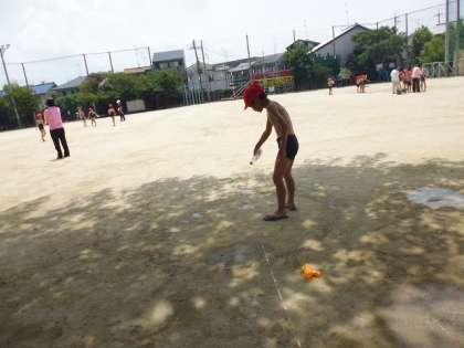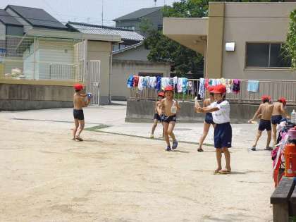 生活科の学習で,夏の青空の下,水遊びをしました。