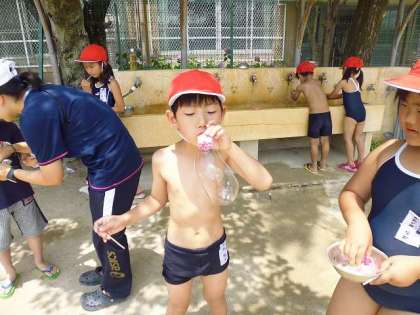 水をとばしっこしたり,地面に水で絵を描いたり,シャボン玉をしたり・・・。